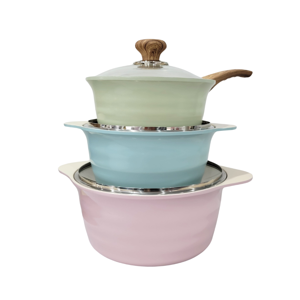 Bộ Nồi Đáy Từ Ecoramic 3 Món TRPIH3 được làm từ chất liệu hợp kim nhôm cao cấp, phủ lớp men chống dính. Với thiết kế độc đáo và sang trọng, bộ sản phẩm này sẽ làm cho bếp nhà bạn trở nên thật hoàn hảo. Bộ sản phẩm có 3 món gồm 2 nồi (20 & 24cm) và 1 quánh (18cm).