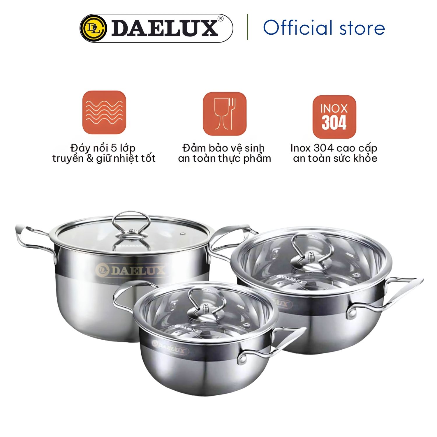 Bộ 3 nồi Daelux với nhiều kích thước đường kính khác nhau lần lượt : 16cm – 20cm – 24cm giúp người dùng có thể thoải mái sử dụng để chế biến nhiều món ăn theo nhu cầu của tất cả các thành viên trong gia đình.