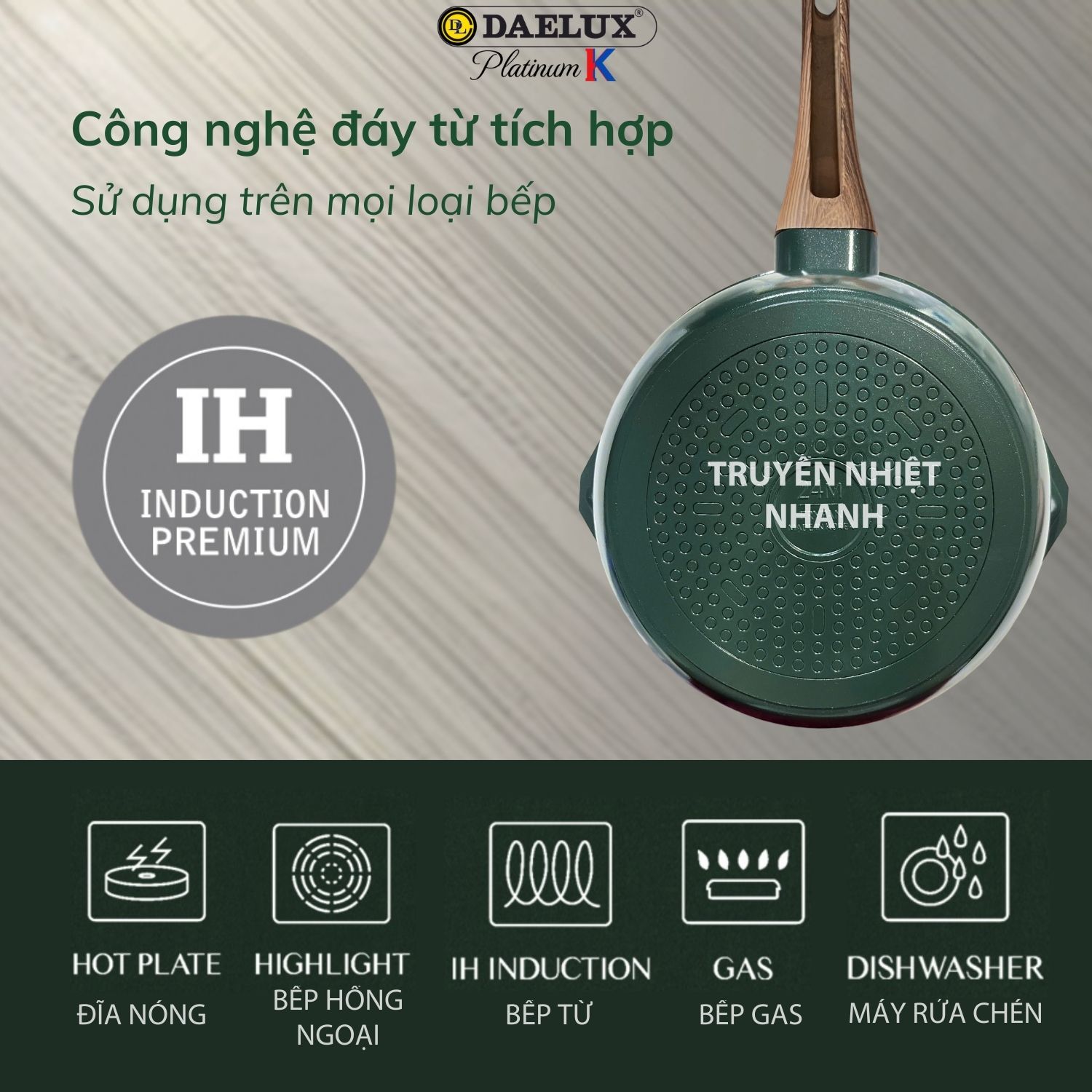Từ bếp gas, bếp hồng ngoại đến bếp từ IH, chảo Daelux PlatinumK đều hoạt động mượt mà, mang lại trải nghiệm nấu nướng linh hoạt cho mọi gia đình.