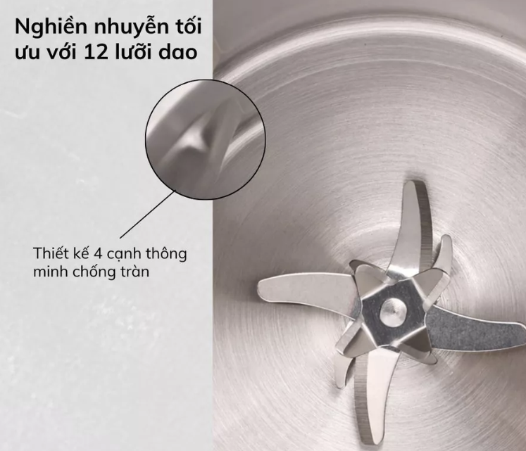 8 lưỡi dao inox sắc bén, xay mịn dễ dàng cả hạt cứng.